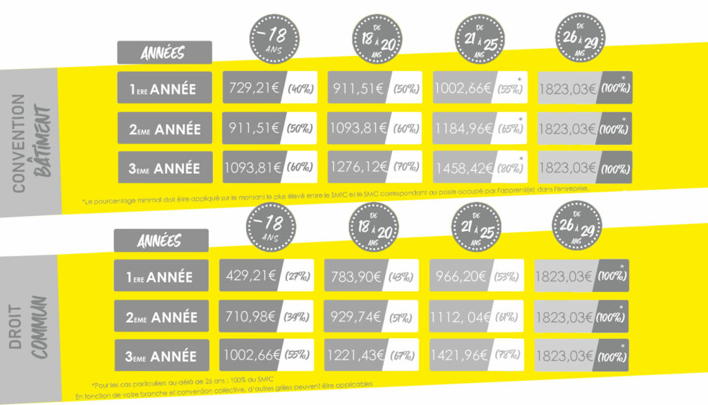 Vous percevez un salaire déterminé en pourcentage du SMIC et dont le montant varie en fonction de votre âge et de votre progression dans le ou les cycles de formation faisant l’objet de l’apprentissage.