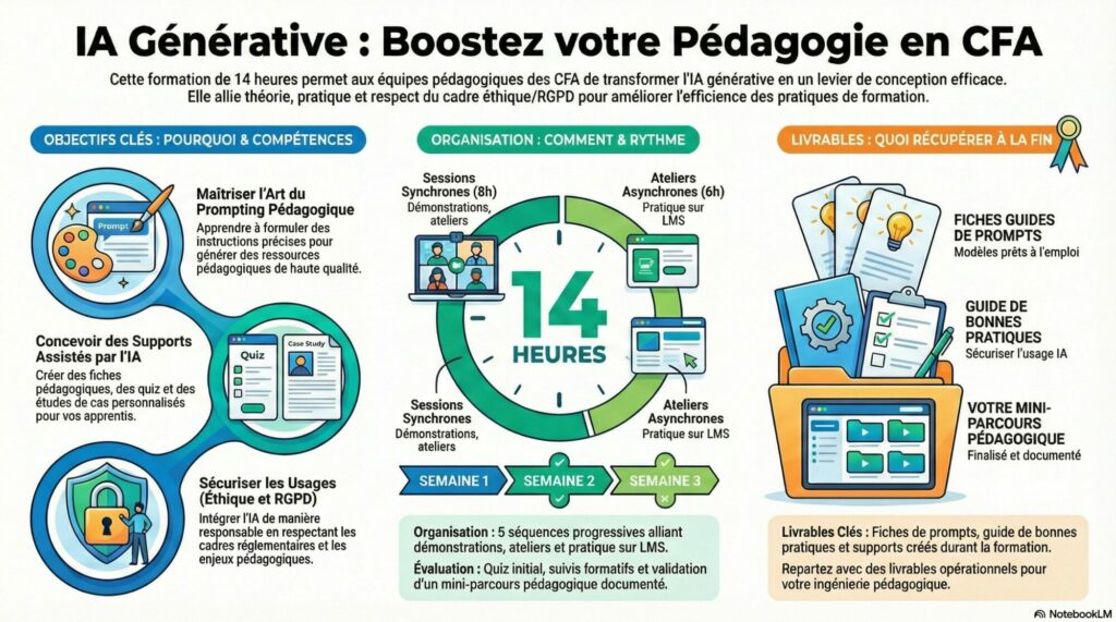 Finalité : Permettre aux formateurs et équipes pédagogiques de CFA d’intégrer l’IA générative comme outil d’aide à la conception pédagogique, de manière efficace, responsable et conforme aux exigences éthiques, pédagogiques et RGPD, afin d’améliorer la qualité et l’efficience des pratiques de formation.