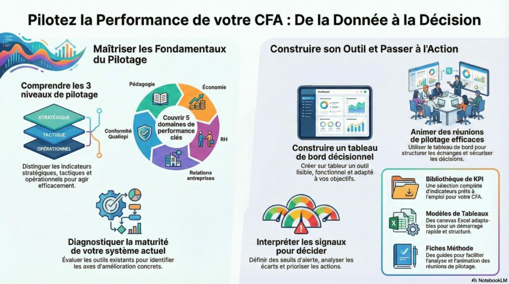 Finalité : Permettre aux directions et équipes de pilotage des CFA de concevoir, exploiter et animer un dispositif de pilotage par indicateurs, fiable, lisible et utile à la décision, en cohérence avec les exigences institutionnelles et Qualiopi.